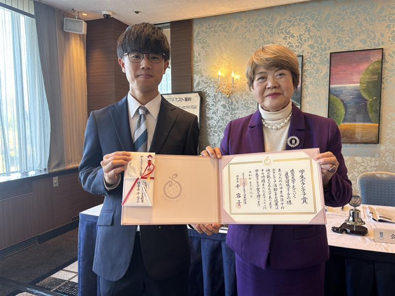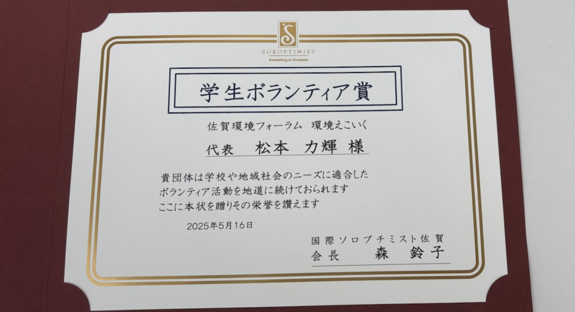 本賞の受賞にあたっては、まず、日頃の地域に根ざした活動が評価され、5月に国際ソロプチミスト佐賀様より学生ボランティア賞をいただきました。その後、各地の受賞団体の中から推薦を受け、全国選考を経て、11月に公益財団法人ソロプチミスト日本財団学生ボランティア賞を受賞する運びとなりました。
